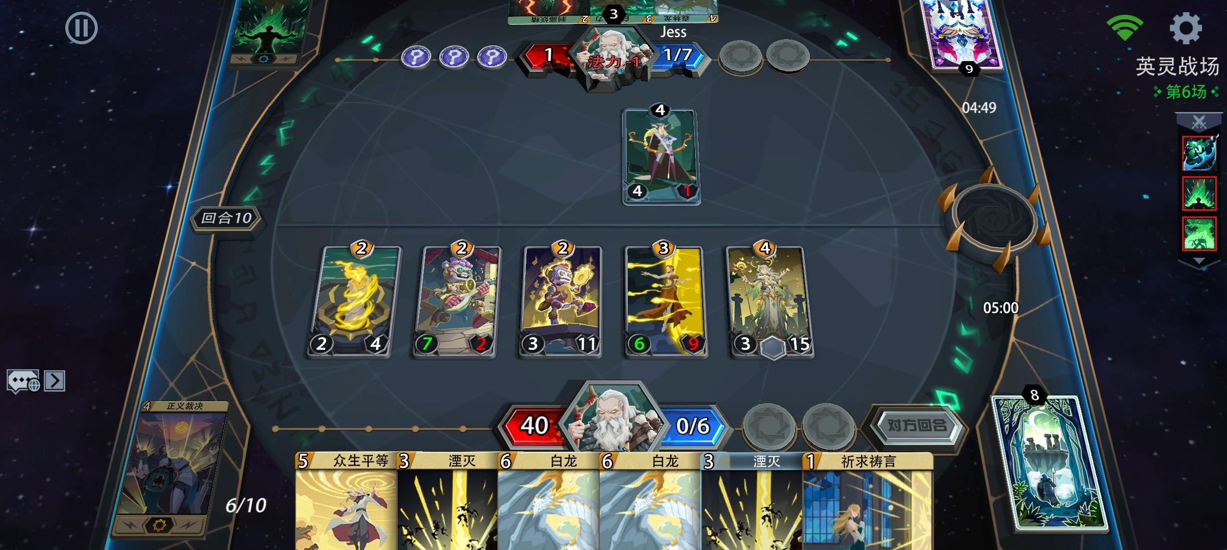 第一步: 选中敌方4号位的魔咒抄录员发动影袭, 将魔咒抄录员送入墓地 第二步: 在我方6号位召唤荒沼猎人, 荒沼猎人触发进场效果,选择墓地中的魔咒抄录员加入手牌 第三步: 在我方4号位召唤魔咒抄录员, 魔咒抄录员触发进场效果,选择牌库中的透视之眼加入手牌 第四步: 在我方3号位召唤见习秘法师, 见习秘法师触发进场效果,选择我方5号位的惩戒爵士将其变为衍生体 第五步: 发动透视之眼, 将牌库中的五张