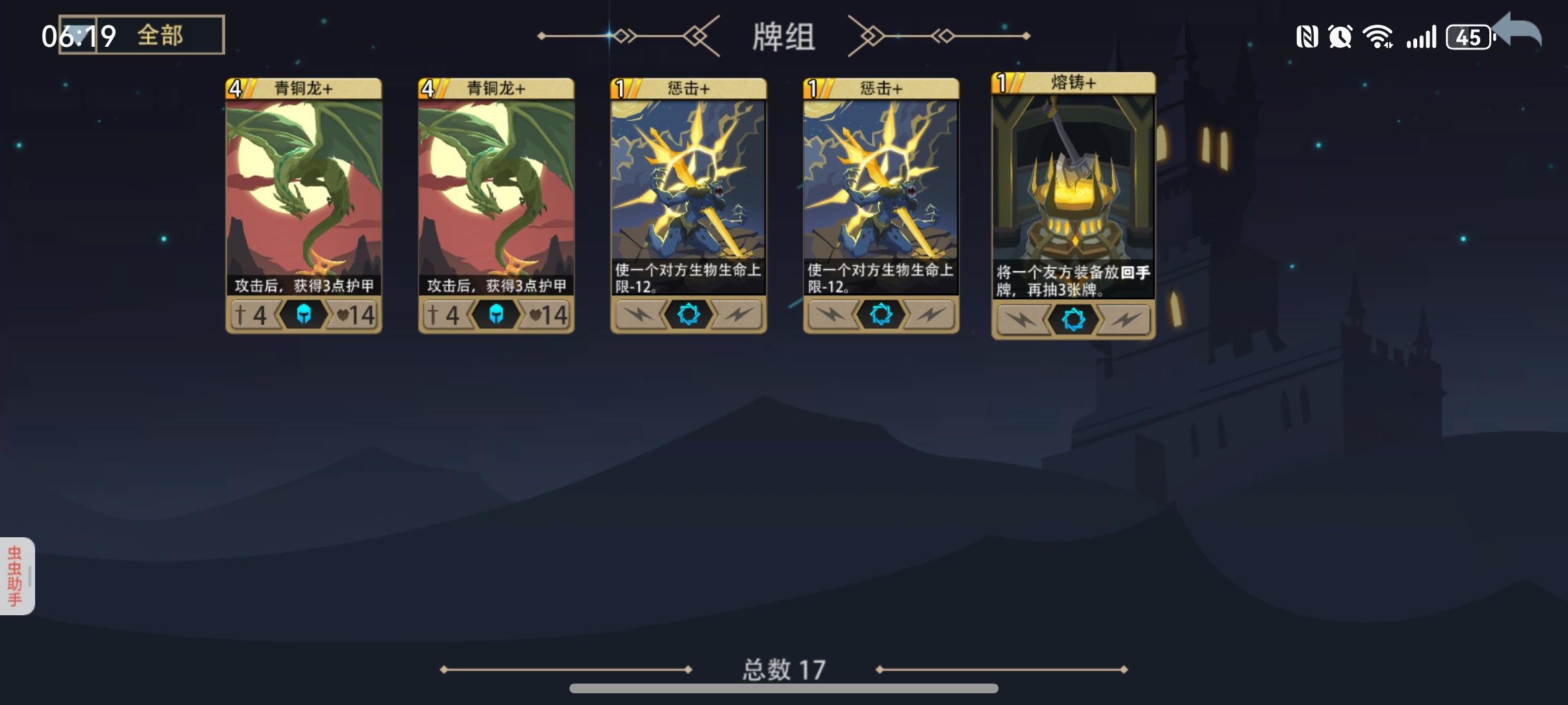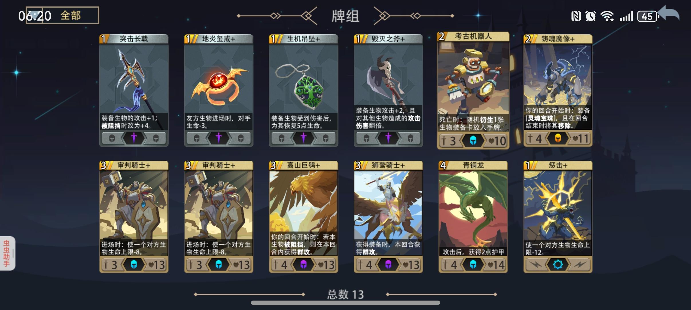 只能过第六层已经按照论坛攻略拿到关键牌了,图片2和3就是牌组。但是木系没有过牌手段,经常法力6点,但是每个回合只能抽一张牌。场上的生物又撑不住,具体看图片4和5。