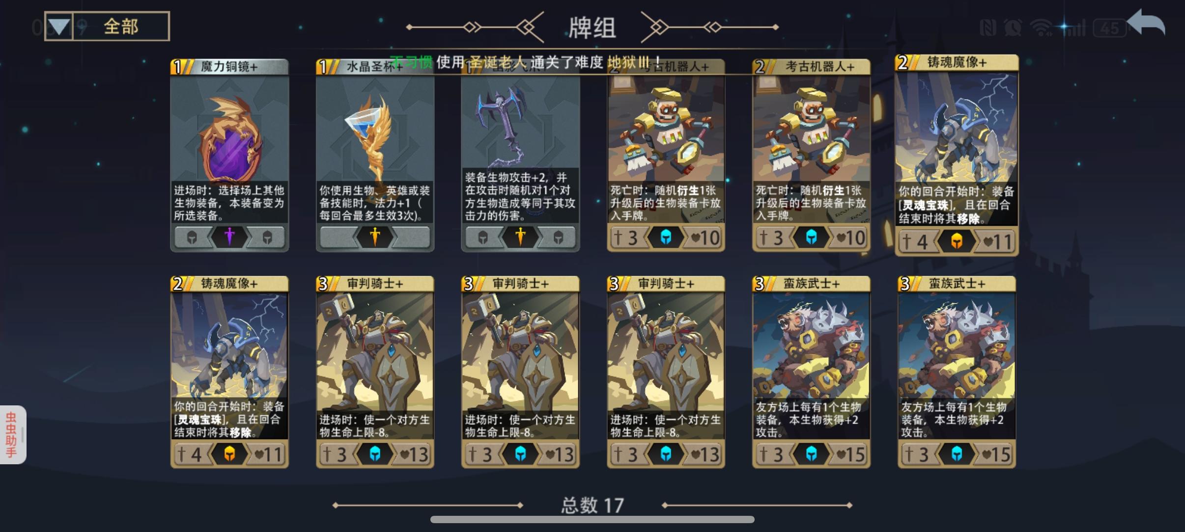 英雄30级,2000魂(抽英雄最黑的一次,150抽满)黑塔及地狱3都是一遍过,感觉强度还可以。地狱3初始全封魔法,只留了神恩术和熔铸,保证过牌,装备全封金英雄装备,只为快速当上圣杯人柱力非初始只开了狮鹫骑士,装备开了幽影飞爪和铜镜。刚好3把不同的套路大家可以探讨一下,蛮族武士就一超级赛亚人,随便都20几点攻击;狮鹫骑士把把群攻,上个斧子随便砍翻一切;火炮工程师没拿