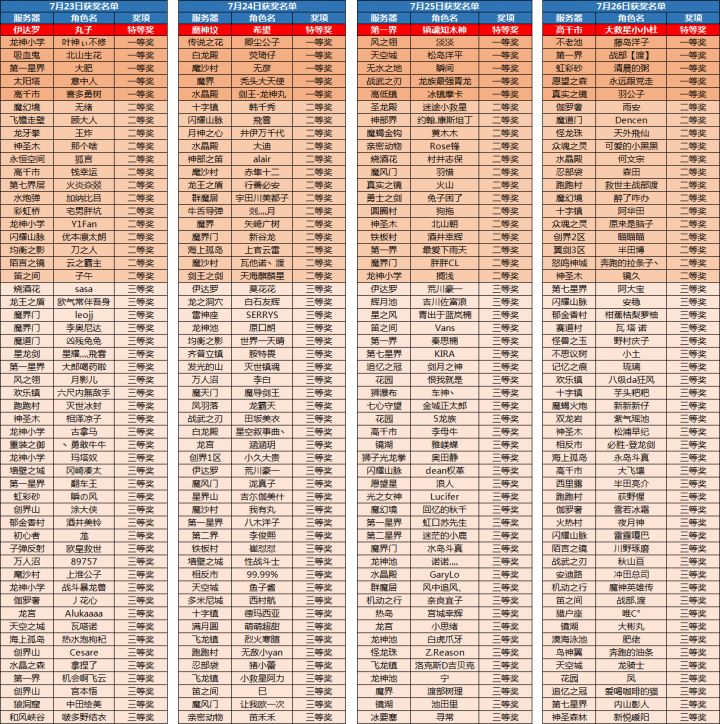 恭喜以下救世主中奖,及时在游戏内填写收货信息。如有疑问可联系游戏内在线客服进行咨询。
