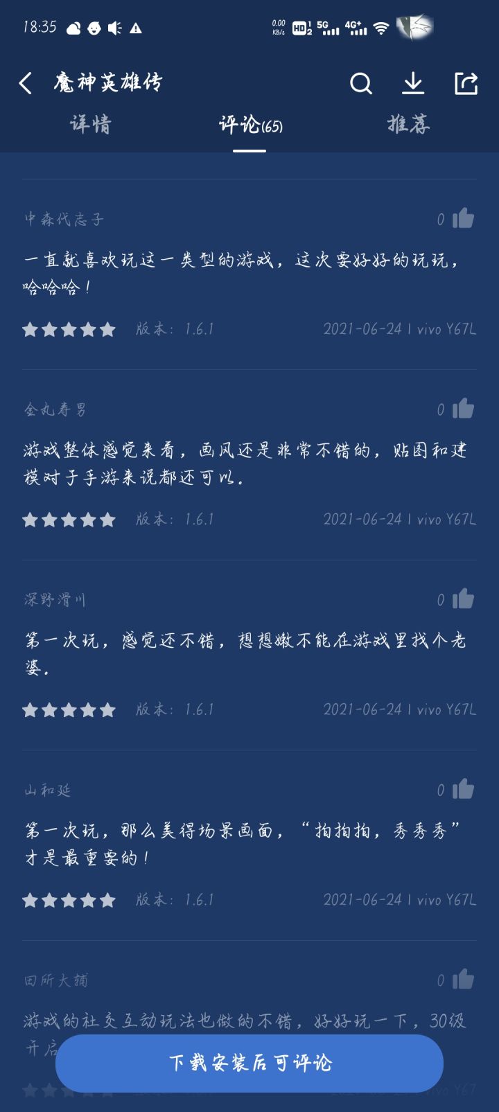 刚刚问了一下渠道服哪里下载 版主说手机的应用商店 我去搜了一下看了一下评价。 全都是厂家自己刷的 还用的是几乎同一个型号 vivo y67 这都是七八年前的手机了。还不退休?我说怎么喜欢榨取玩家剩余价值呢。这不还榨取手机剩余价值嘛哈哈,不要问我为什么加那么多丸。因为这样能搜到的人多一点