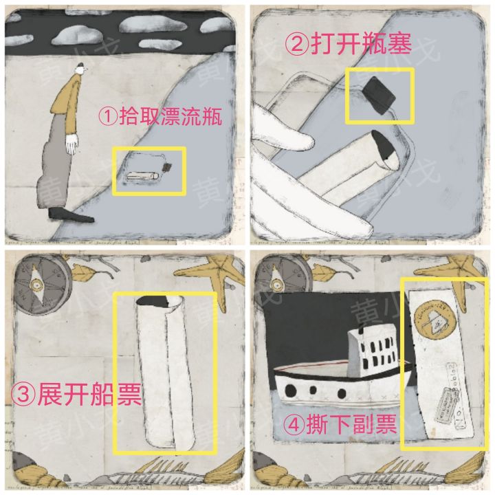 1.拾取漂流瓶,打开瓶塞;展开船票,撕掉副票2.擦掉玻璃上的雾;拉开行李箱的拉链,打开行李箱,完成摆放行李小游戏🔶点击图纸,收入“信封”,后面会用到(“信封”抖动表示会用到信封里的线索)3.按特定的顺序按下相机上的黑色按钮,拍照片;下拉照片上的太阳,月亮升起;按从上到下的顺序移开飞机上的云层🔷顺序:右下、左上、右上🔶点击时间(18:20),收入“信封”,后面会用到(“信封”抖动表示会用到