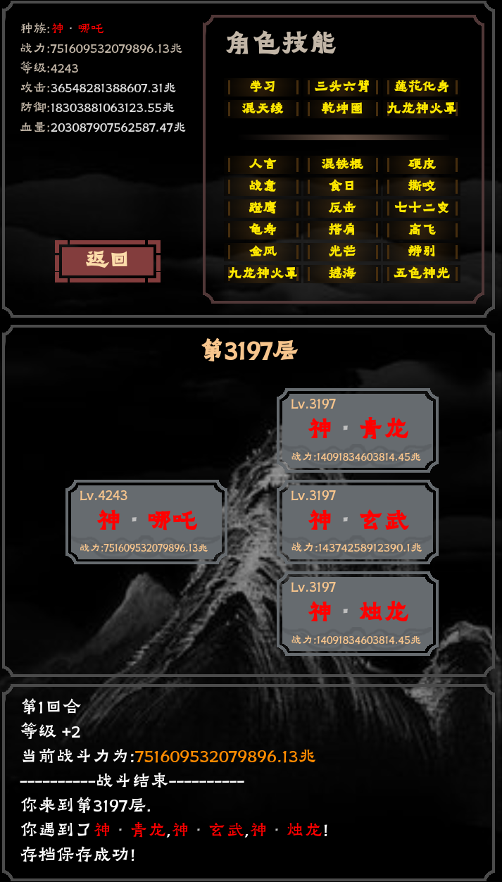 如同我的标题所说,我这个流派方法,攻击每次增长在2-10倍,攻击非常非常的高,这个游戏已经通关好几次了,挺有意思的一个刷子游戏以下是我觉得最不错的一套搭配1.首先是攻击型技能:真龙血脉(应龙,五爪金龙身上有,详细看图鉴):全属性永久增长110%龙脉(蛟龙,飞龙身上有,详细看图鉴):每个回合开始前全属性必然提高105%(持续一回合)暴怒(白鹅):每个回合开始前攻击必然永久提高130%战意
