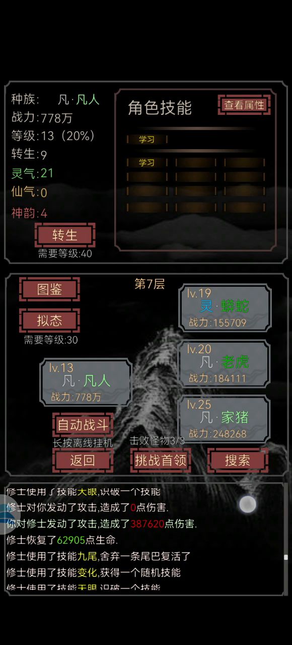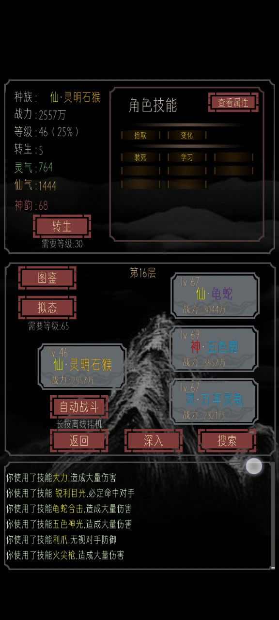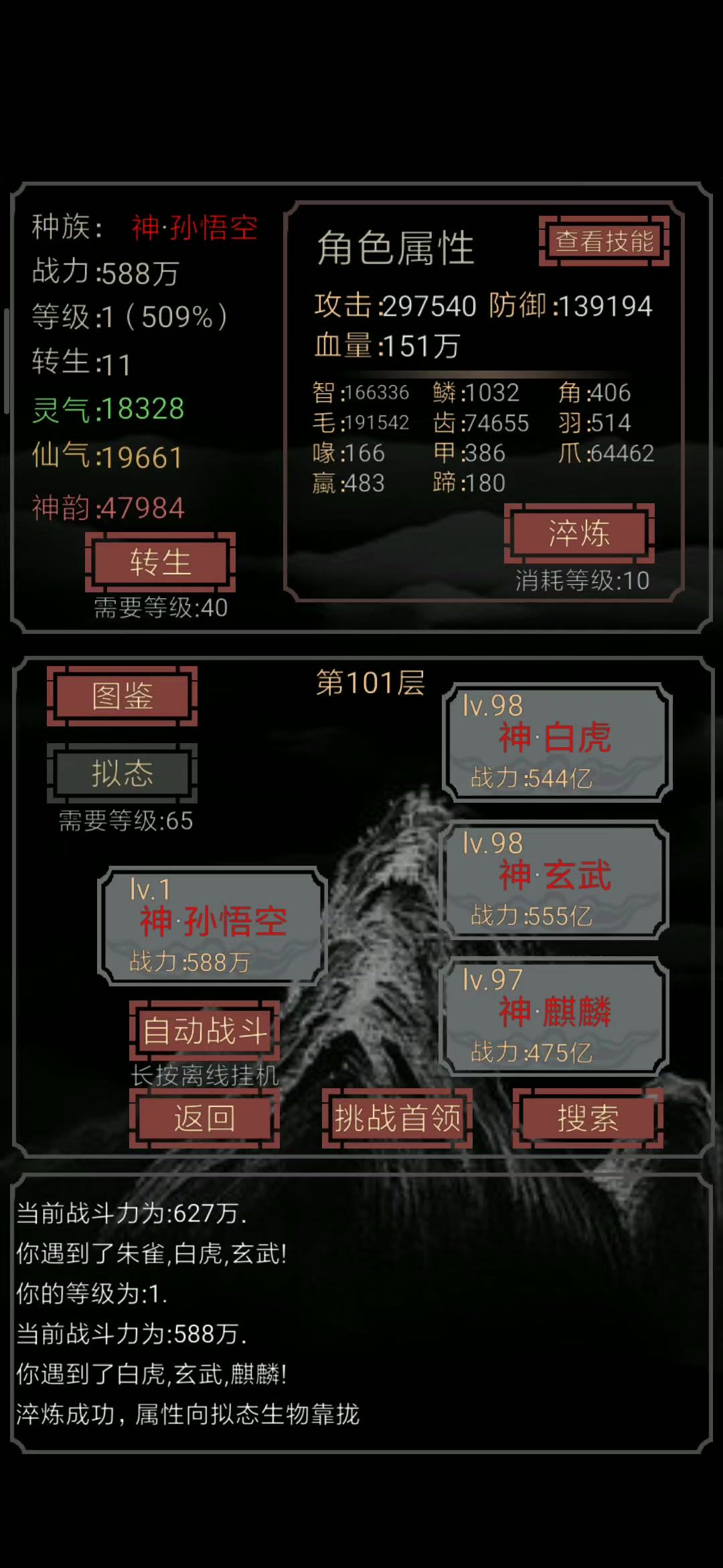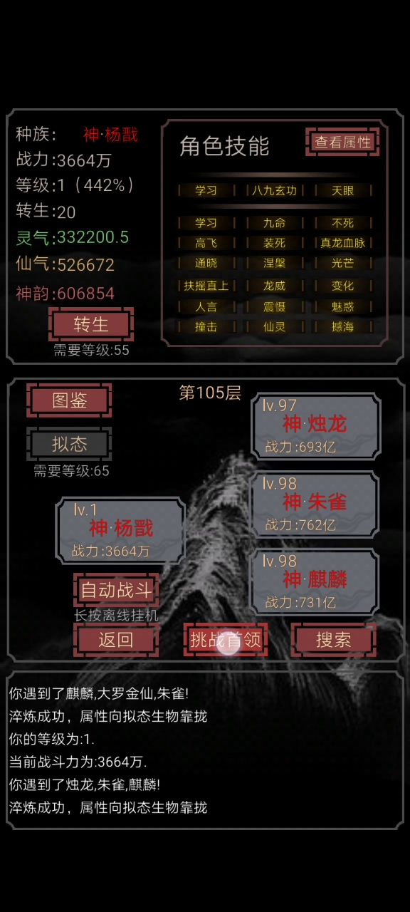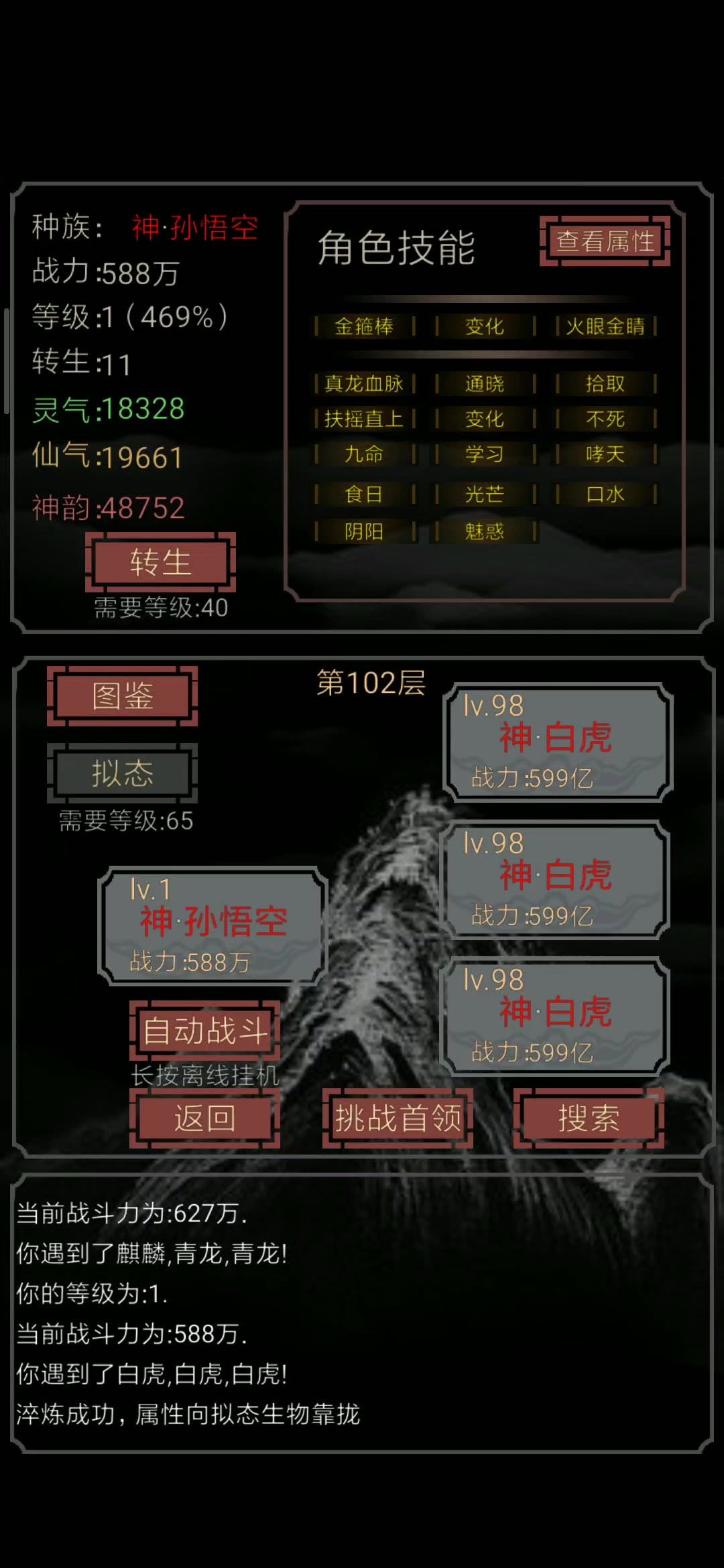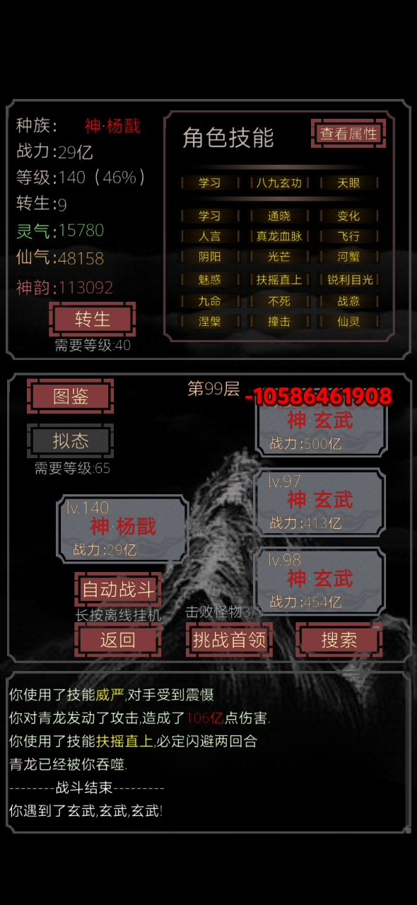 玩过几次,再玩的时候找不到完整的攻略很烦,干脆再玩通一次自己写一个。 一:追求完美的话注意以下两点。 1.转生20次(开技能格子需要) 2.先不领图鉴奖励,靠转生开图鉴到85%以上(领随机图鉴能保证开全boss) 二:技能 1.以下只列出最强技能 2.特别注意:要保证 九命 在 不死 和 涅槃 的前面,如果先触发了 不死 用过之后再脸黑没触发 九命 直接gg) 3.技能格子不够的话舍弃免攻类的最后3个。 (附视频:这套技能1级杨戬打孙悟空一次过。) 4.技能 技能:学习 变化 通晓 复活:九命 不死 涅槃 属性:真龙血脉 龙威 免攻:魅惑 震慑 人言 装死 撞击 仙灵 撼海 闪避:扶摇直上 光芒 高飞 5.字数限制,技能出处放评论吧。