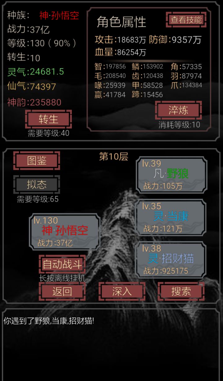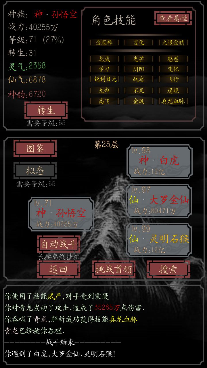 玩了二天通关!总结了一些心得,分享给大家,让萌新更好的游戏体验!上图先!首先,说下影响游戏的几个要点:1、转生2、灵,仙、神数值3、属性里的各种型类(鳞,毛,角等)4、图鉴解锁5、拟态(定向拟态)6、淬炼7、成就系统首先,说下转生提升属性这一点,其实转生的百分之十目前来说没有太大意义,而转生可以解锁很多功能,所以开图先二转,解锁定向拟态!不用过于追求转生,后期拟态或者学技能不好时
