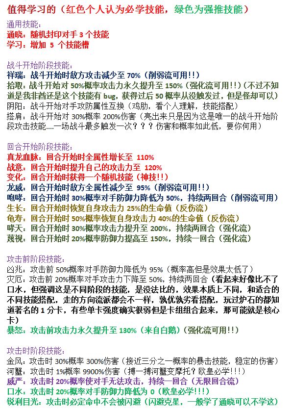 1.技能强度:红>橙>蓝>绿>白;2.请按流派选择技能;3.请按流派选择技能;4.请按流派选择技能;5.数据可能会有一些错误,望提出来改正。反击流:https://www.taptap.com/topic/6011866(打妲己必带通晓封九尾)闪避属性流:真龙血脉+生长+光芒+高飞