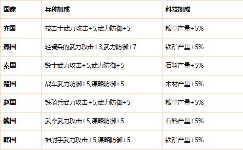 在《大秦帝国》中,每个国家都有自己的特色。所以不同国家会有不同的初始加成。特长兵种获得的初始属性加成会比别的国家要厉害哦。某些方面的科技产出也会影响游戏的初始体验。 如果想要在初始获得一定优势.可以考虑择优而选。接下来小编为你介绍每个国家的特色兵种以及科技。 (1)具体加成列表 国家 兵种加成 科技加成 齐国 技击士武力攻击+5,武力防御+5 粮草产量+5% 燕国 轻骑兵的武力攻击+3,武力防御+