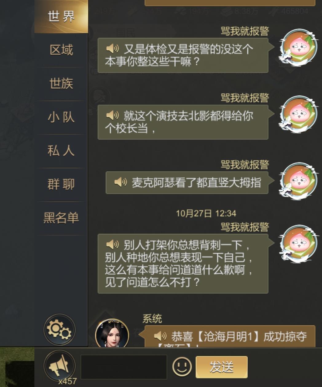 具体事情我是看世界上说的,昨天吉祥有一个玩家去打5人种田玩家氏族的分城,没打过,然后种田玩家被打分,世界说了几句,然后吉祥觉得没打过种田玩家的分城,有点掉面子,派了5个人,群殴种田玩家的分城,这种事,怕是只有吉祥做的出来,我叫关中寻花,他们打的是燕弓骑,塔寨的,就5个人氏族,66666