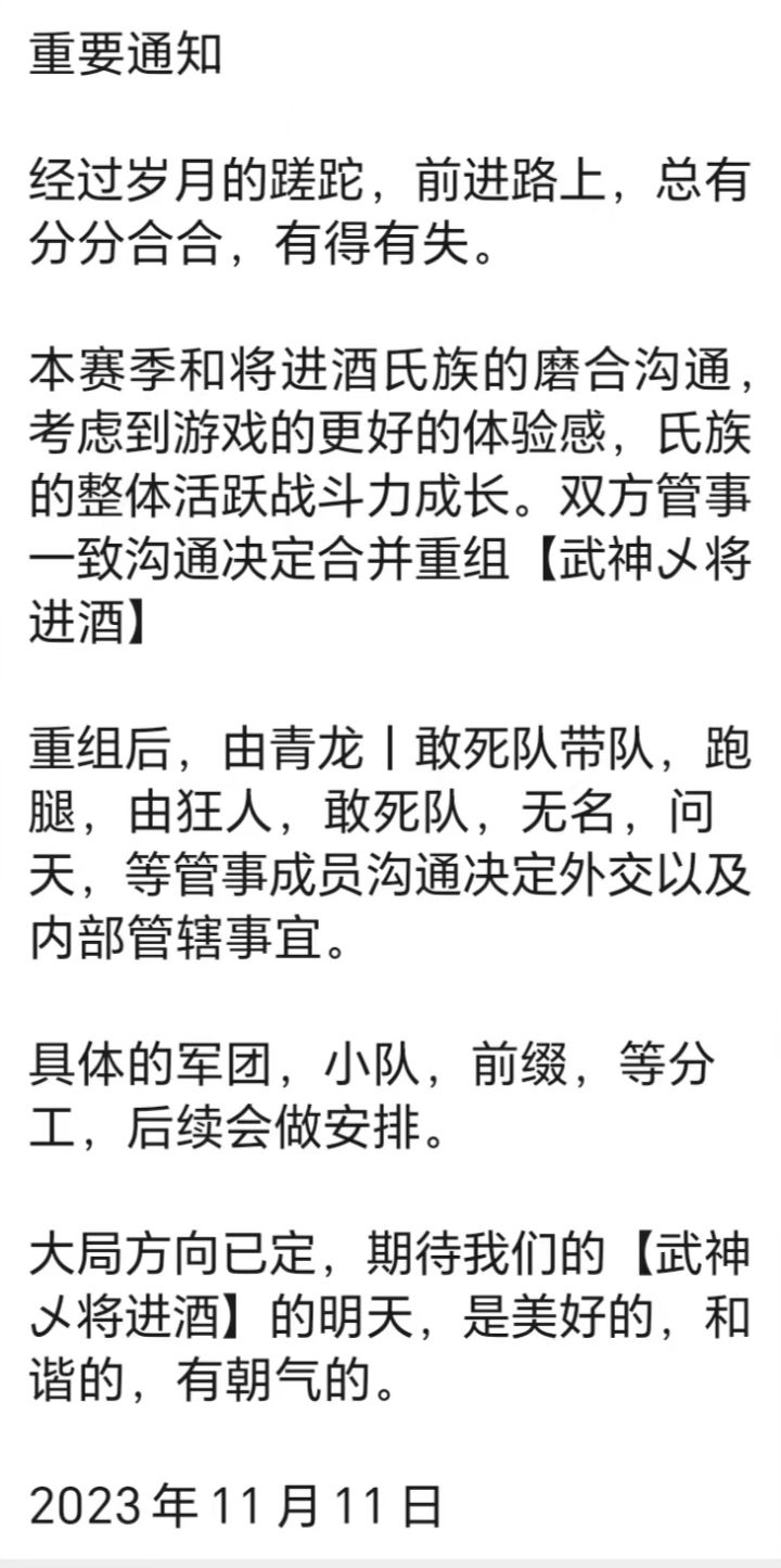 我们密州改名后的第一个赛季收了上升期的武神,下赛季我们就要打凤鸣和明月照九州,把这两个废物氏族踩下去,大秦唯我武神乄将进酒一家独大,你们两家识相的赶紧解散成为我氏族的一个小型军团,不然遇到给你们打解散沦一个赛季。擦干净脖子等死吧。