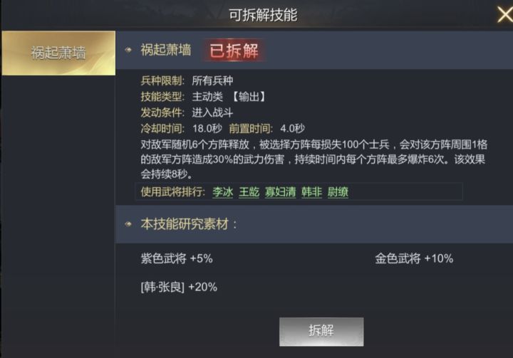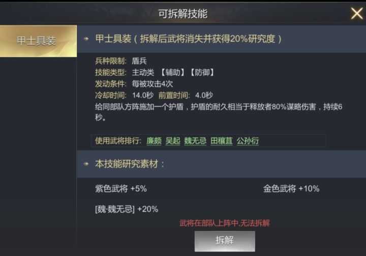 甲士具装:护盾可吸收伤害,不分受到的技能还是普攻伤害,吸收到一定量就会消失;如期间所受伤害没到护盾量,6秒后消失。祸起萧墙是看技能装备者的武力