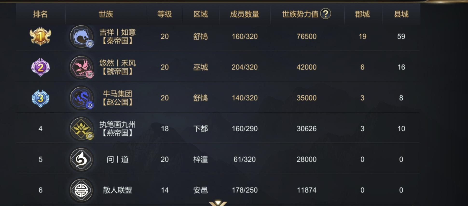 秦国:九丨尊,九尊天下,夜幕军团,青云书院,雇佣军六国:吉祥丨如意,梦桃源,桃源副盟,九紫黎火,执笔画九州,御天下,新上线 策划这次的分区,很明显六国要比全国人数多,九尊吉祥积怨已久,2边的氏族之间也有矛盾#大秦帝国之帝国烽烟 让我们期待这个疯狂的六国到底哪边会胜出