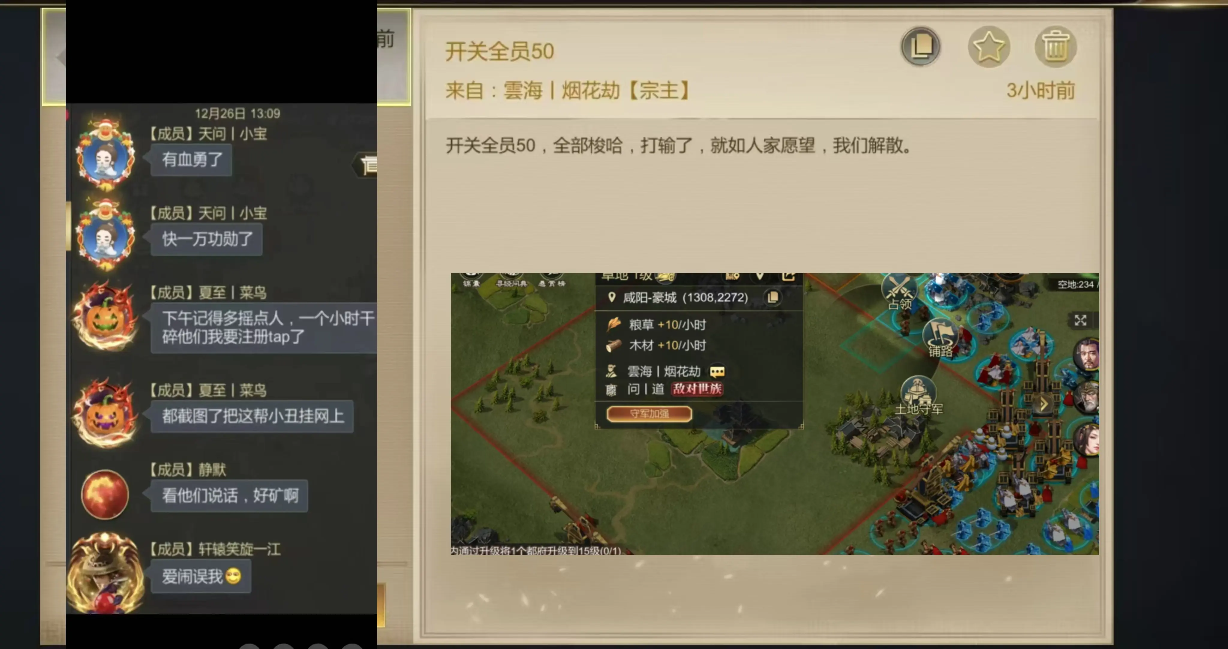 新晋氏族的德与行…氏族解限,按耐不住德行,早上私聊诓骗要求放关,第一宣战,后面协商放了过后,时间不过5分钟,第二次宣战直接几个人打出身地关口,被发现过后说是为了刷战功,我出去反击打他们要塞,然后以起理由开始主导…然后附属氏族在起前面要求同盟借路,发现一系列操作已经时间过晚!!!!!果然大秦是真纵横和阴阳论坛#