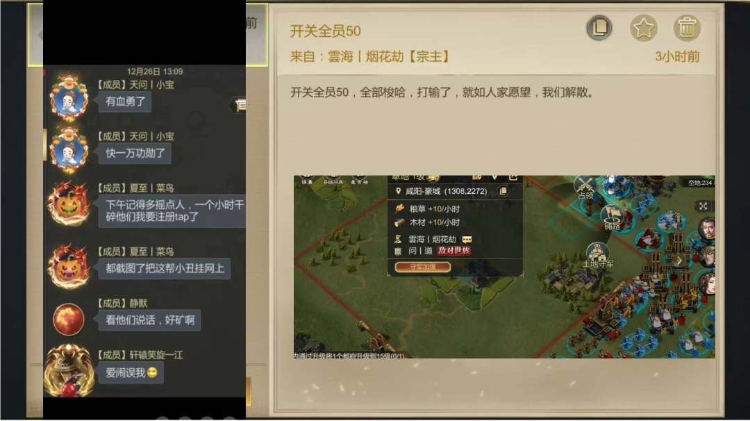 具体事情我是看世界上说的,昨天吉祥有一个玩家去打5人种田玩家氏族的分城,没打过,然后种田玩家被打分,世界说了几句,然后吉祥觉得没打过种田玩家的分城,有点掉面子,派了5个人,群殴种田玩家的分城,这种事,怕是只有吉祥做的出来,我叫关中寻花,他们打的是燕弓骑,塔寨的,就5个人氏族,66666