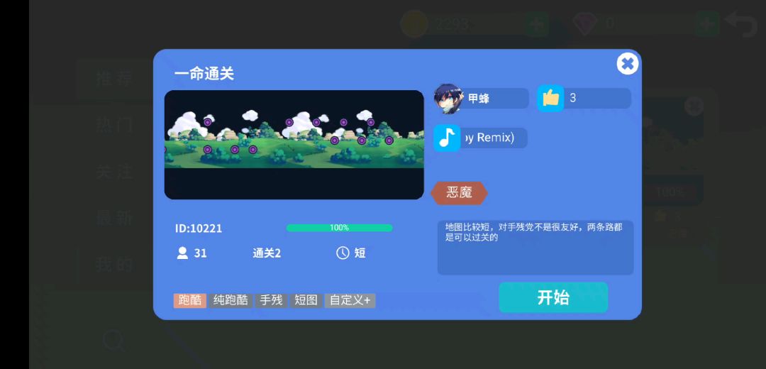 地图名:一命通关 纯跑酷地图,为了避免被手残党寄刀片(不是偷懒),图做的比较短。还算是可以轻松愉快地过关