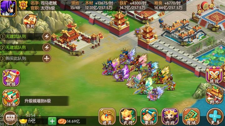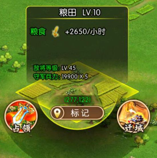 木材、粮食、铁矿是三种每个玩家都必备的战略资源。快速获得资源的方法很简单,那就是占领和掠夺!1、在野外占领对应的高等级的资源地。每个资源地都有对应的资源产出,土地等级越高,产出越多。2、加入同盟去占领县城、郡城、州城!这些城池将为同盟玩家提供巨额的资源加成。3、掠夺其他玩家的城池,每次掠夺都能够掠夺其他玩家的非安全仓库资源储量的10%,这是很可观的一笔产出。4、升级主城内的良田、铁矿和林场