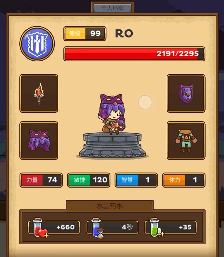 老道理先上图 看见这回血量是不是很心动呢?我给命名为: 究极回血套,下面上图 这个是本瓜的装备图解和加点 加点核心: 主敏捷(120+满暴击),次力量 核心装备: 蝴蝶头(必须五星)获得难度:零,升级难度:微肝 非酋衣服(必须五星)获得难度:肝,升级难度:肝 剩下的装备随自己开心就好个人推荐如下: 辉煌刀(既然要闪避那么自然越多越好咯) 获得难度:零,升级难度:微肝 魅影盾(伤害不够盾牌来凑) 获