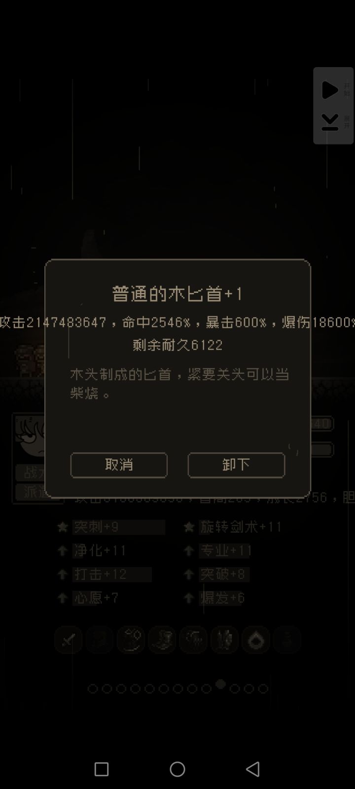 另外,游戏里还有个胆量值系统,小人默认胆量值为200,当胆量值接近或低于100的时候,小人在战斗时有概率会崩溃……为啥我要突然扯这个胆量值系统呢?想想看,勇者有红癖黄癖,灰暗的美术风格,且勇者有200点压力值。这不就是PC端经典游戏 暗黑地牢 里面的经典设定嘛😂看得出作者在设计游戏的时候,暗黑地牢对他启发很大。