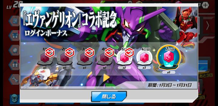 大概1月20号左右eva联动入坑。联动活动分三期,第一期积分制+每日任务+全服任务。积分制就是够积分送奖励,每日任务和全服任务也是。所以入坑就能收到一堆素材和两sr活动人物,对萌新来说极其舒服,2个全身60级+好一点的支援,就能自动过,如果不看加成,自动挂机最后一关就是。(轻松到手)到了第二期和第三期,其实两期内容是一样的,只是分上下编,也就是分开两次开放。活动形式变了,不再是到达积分送奖励