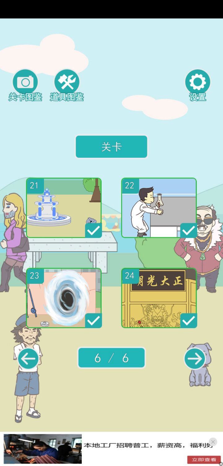 第一关拿陨石去卖第二关先点左下角箱子再向右把刷子房在油漆上最后吧刷子拿去刷墙第三关向右帐篷后面有斧子丢进河合身背后有个普通斧子第四关拿吸尘器向右拿钱包硬币去买电池拿吸尘器吸取款机第五关垃圾桶里有月光宝盒向右放在石头上有针放在钟上转时间拿硬币去买彩票第六关向右商店左下屠龙宝刀去杀怪拿去卖钱第七关先向右拿电视机上的金子沙发下的钳子后面的门里有个锯子再回去拿菜刀和斧子【电饭煲旁边】砍断锁链就