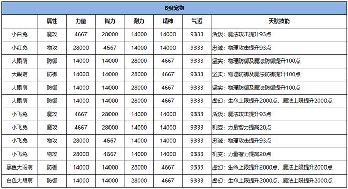 《腾讯雪鹰领主》手游中,有7款S级宠物,7款A级宠物、12款B级宠物和19款C级宠物。注:表格中部分宠物名称、属性、天赋技能相同,但外观颜色不同。