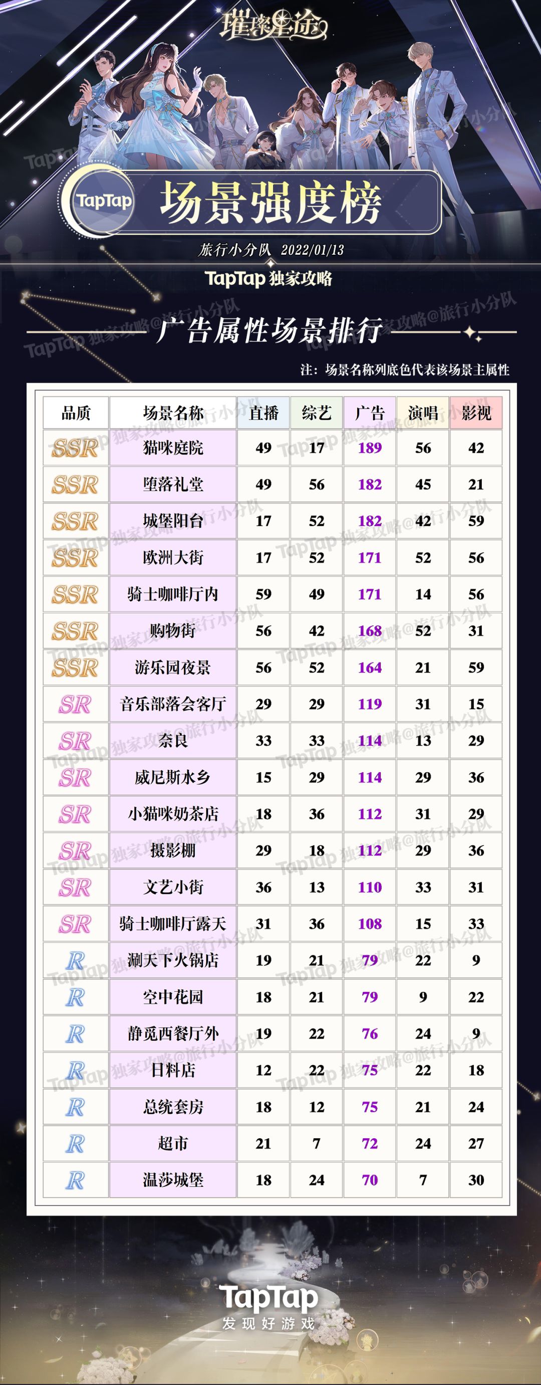 《璀璨星途》中场景一共五种属性,品质分SSR、SR、R三种,没有技能,可根据品质高低和需要的属性养,同时记得养可以升华的高品质场景。 可以先养升华较多的SR,常驻的SSR可以等抽到重复SSR能升华的时候再养。 五个属性的场景强度榜如下:
