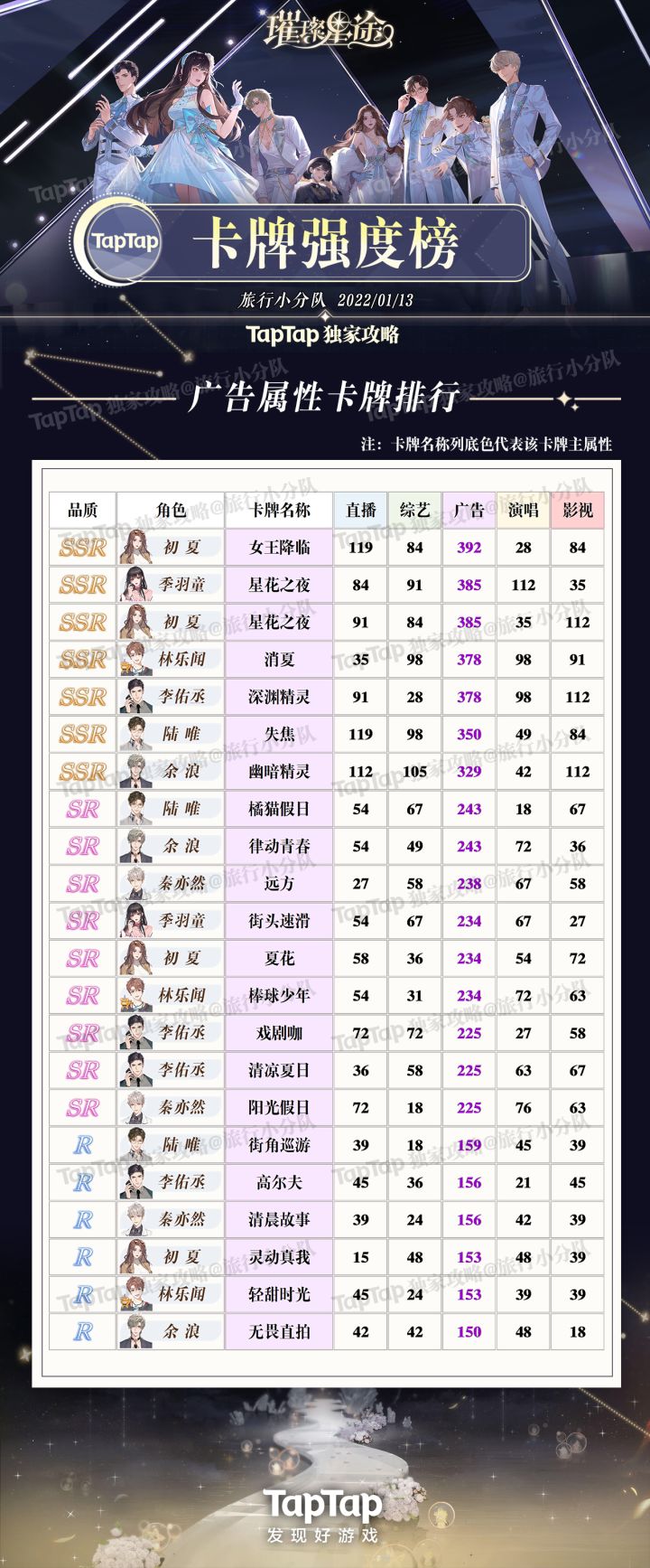《璀璨星途》中卡牌一共五种属性,品质分SSR、SR、R三种,没有技能,可根据品质高低和需要的属性养,同时记得养可以升华的高品质卡牌。 可以先养升华较多的SR,常驻的SSR可以等抽到重复SSR能升华的时候再养。一定要记得给主卡进化,进化能够带来大量属性加成!微氪玩家注意不要养氪条限定卡,因为很难升华。卡牌数值为初始面板数值,不含任何加成!五个属性的卡牌强度榜如下: