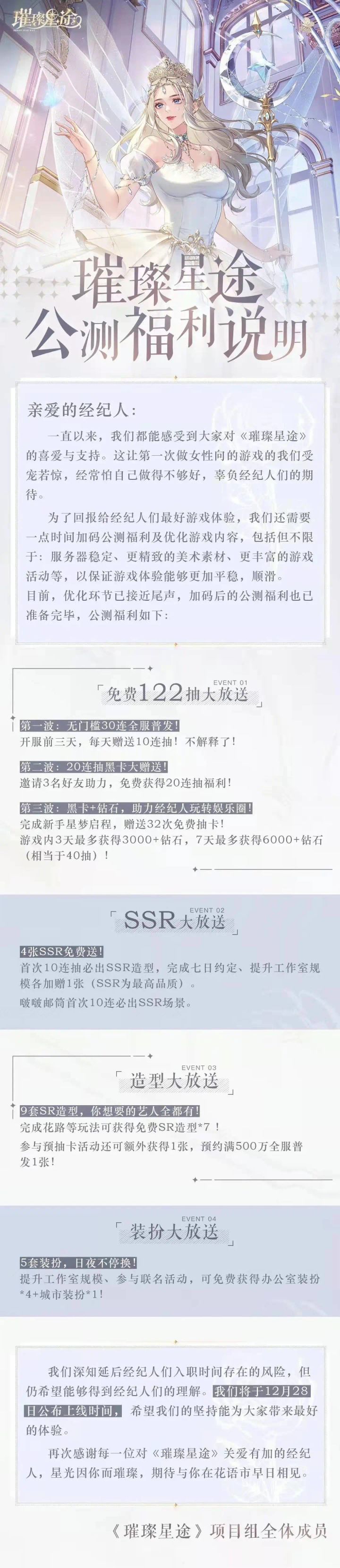 亲爱的经纪人:自从上次告诉大家12月就要与大家见面以后,小狮子也收到了各位经纪人来自四面八方的留言,我也感受到了经纪人们对《璀璨星途》的向往,同时大家的建议也对游戏的完善起到了很大的帮助作用,大家的热情和支持还有耐心的等待,都让我们深受感动!我们研发团队也进入到最后的攻坚阶段,为了让游戏能更好的与大家见面,我们再次调整了游戏内容和相关福利。为了感谢各位经纪人的理解和等待,我们将在12月28日公