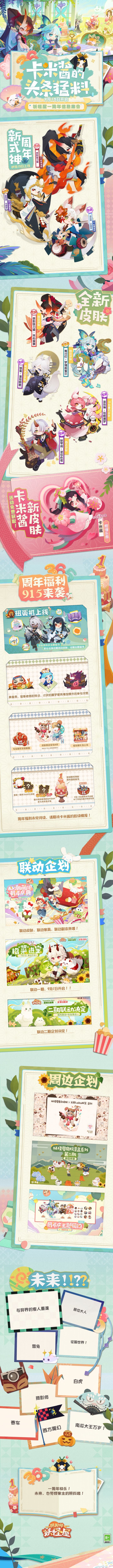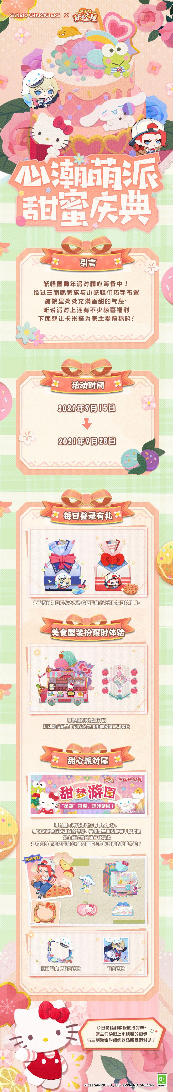 精心装扮等待着新朋友的庭院 充满了甜腻的气息 即将到来的小可爱们 同样准备了许多礼物 特意委托卡米酱提前传达给家主 来康康到底有哪些好东西呢? 详情请戳下方长图↓↓↓ ☆活动时间☆ 9月15日维护后 - 9月28日23:59:59 ☆联动福利一览☆ ·每日登录有礼 活动期间,每日可从大天狗或酒吞童子处领取每日礼物哦~ ·美食屋装扮限时体验 凯蒂猫的美食屋开启,活动期间家主均可以免费试用美食屋联动装