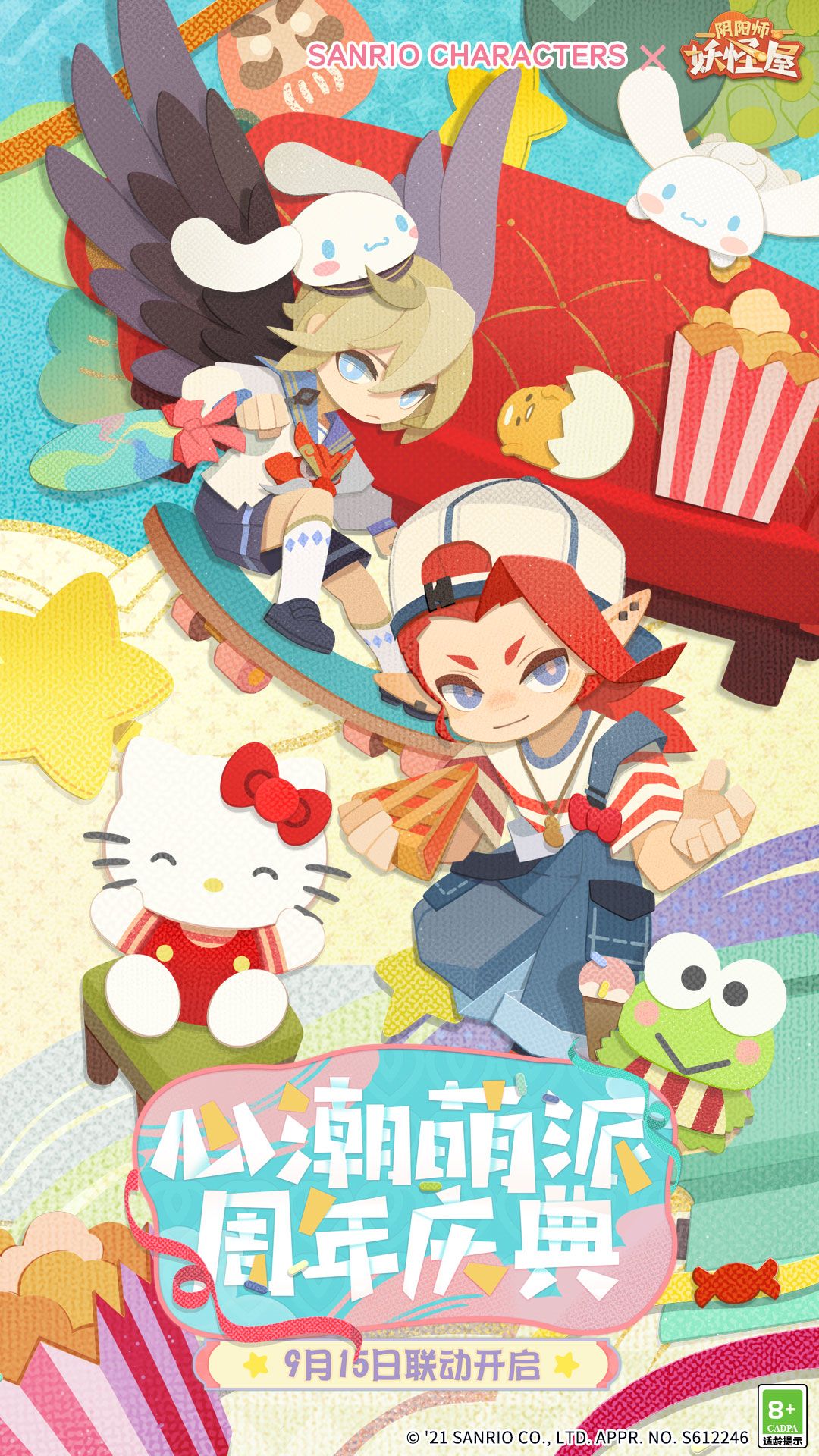 《阴阳师:妖怪屋》×三丽鸥家族来啦! 凯蒂猫、大耳狗、蛋黄哥和大眼蛙 即将造访妖怪屋,9月15日联动开启! 小妖怪们换上了独家定制的新装 美味的甜点与欢乐的气氛将小妖怪们团团围绕 可爱活力双双加倍! (๑•̀ㅁ•́ฅ)三丽鸥家族传递着无数的温暖 这一次大家又筹备了怎样的惊喜 做好准备 ,派对即将开始~ 期待新朋友到来的同时 也别忘记帮助忙于筹备庆典的小妖怪们! 周年庆典分享助力活动即日开启! 庭