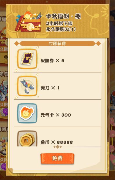 金秋时节,桂花飘香。中秋节与国庆节即将来临,皎洁的明月悬挂在树梢,映照灯火通明处的团圆,悠闲的假期由此开始!庭院摆好了香甜的月饼与精致的美食,还有崽崽们特意准备的节日礼物哦! ◇中秋节&国庆节限时福利◇ 8天免费领取假日福利 活动时间:9月29日0: 00-10月6日23: 59 活动期间,家主每日可前往「商店」-「礼包」页面免费领取节日福利一份! 福利内含剪刀、勾玉、皮肤券等大量资源 周年庆活动