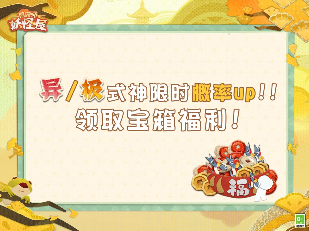 庭院的树叶悄悄变换了颜色,为秋天染上绚烂的色彩。崽崽们在柔软的芦苇荡中捉迷藏,清风将欢笑声吹远~家主快邀请小妖怪们一起远游赏景,共同享受惬意的时光吧٩( *´﹀`* )۶ ◇限时概率UP开启◇ SP(异)/SSR(极)式神限时概率UP提升20% ※SP(异)/SSR(极)式神概率UP! 活动时间:11月8日更新维护后-11月21日23:59 活动期间,家主使用剪刀进行召唤时,SP(异)/SSR(极