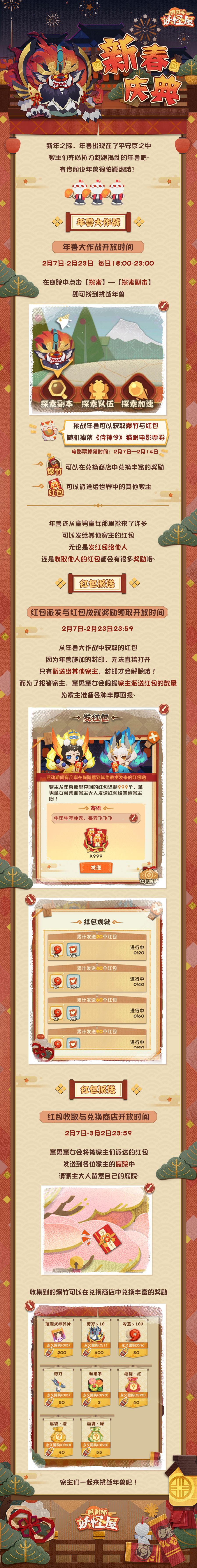 新春庆典快开始了 在小妖怪们忙着迎接新年之际 一声咆哮突然蹿出,威武凶猛的年兽又出来捣乱啦! 红绸、鞭炮赶快放出来,得赶在庆典开始前吓跑它! 击退年兽可以获得红包、璀璨式神碎片、勾玉、剪刀等各种奖励 更有机会获得《侍神令》 猫眼电影票券。 华灯初上,热闹纷呈,一起退治年兽开启我们的新春庆典吧٩(ˊᗜˋ*)و✧* ♢新春庆典♢ 活动时间:2月7日—2月23日 活动内容: ※「年兽大作战」 活动期间每