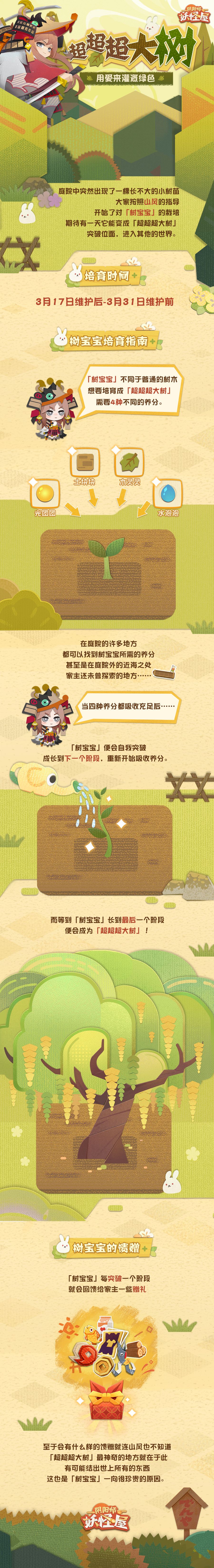 庭院中突然出现了一棵 长不大的小树苗 闻讯而来的山风告诉大家 这不是一棵普通的树苗 而是一棵「树宝宝」 需要用特殊的方法培育才行! ↓更多活动详情请戳下方长图查看 汲取充足的养分 小树苗快快长大 让庭院里绿意更盛吧! ♢「万木萌芽」礼包限时上架商店♢ 3月17日 维护更新后—3月31日维护更新前 「万木萌芽」礼包限时上架商店 售价24魂玉 想要和崽崽更加亲密接触的家主可以加入网易官方《阴阳师:妖怪