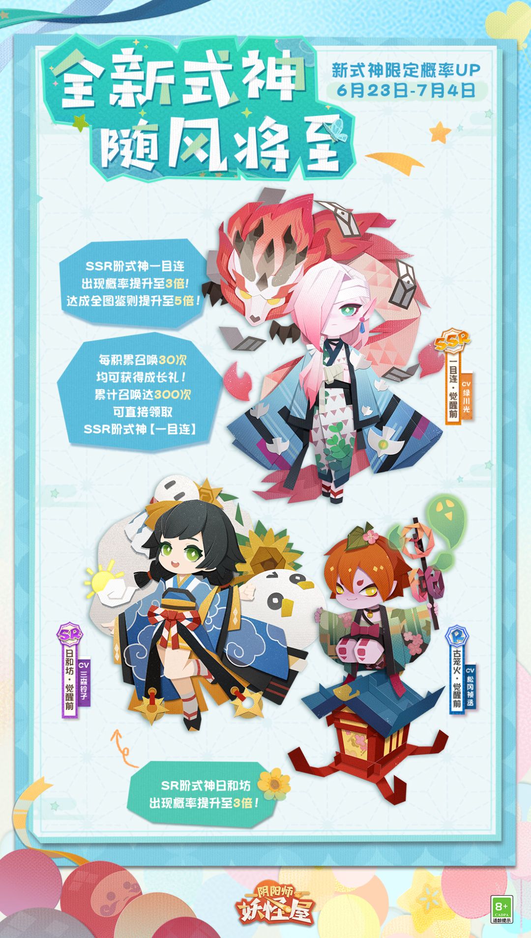 清风拂面,阳光正好 热闹的游乐园中出现了 许多可爱的身影 牵起小手 和小妖怪们一起 畅享夏日游园会吧~ 全新版本将于6月23日开启! ♢版本速递♢ 全新SSR阶式神一目连 携SR阶式神日和坊、R阶式神古笼火入住妖怪屋 新式神召唤概率UP限时开启! 活动期间 SSR阶式神一目连,SR阶式神日和坊 出现概率提升至3倍 如果在本活动开始前已达成SP/SSR全收集 (活动期间达成无此福利) 则活动期间使用