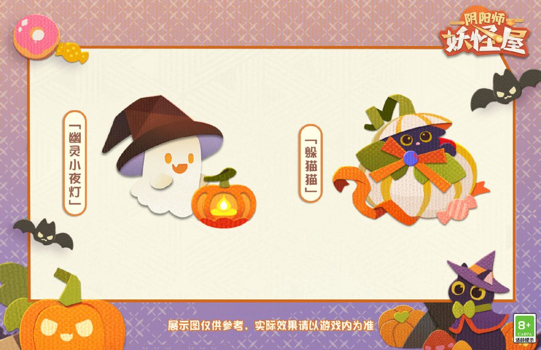 镂空的南瓜灯之中,飘摇的烛火散发温暖光芒。造型独特的魔法帽,被调皮的小幽灵偷偷戴在头上。黑色的脑袋悄悄探出,是哪只贪玩的猫咪躲了起来呢? ◇试胆大会装饰返场◇ 返场装饰:「幽灵小夜灯」、「躲猫猫」 获取途径:家主可在「试胆大会」活动兑换商店中进行限时兑换。 ◇试胆大会活动开启◇ 活动时间:10月11日更新维护-10月22日23:59 活动商店开放时间:10月11日更新维护-10月24日23:59 活