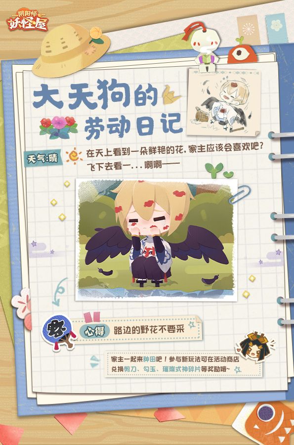 妖怪屋全 员 种 田!为了能一起相互交流种田心得,小妖怪们还写了劳动日记! 只是今天大天狗种田回来后,就一直捂着脸在路边独自悲伤。卡米酱走近一看,发现大天狗的脸上竟然满是唇印! 咦?这到底是谁亲的?真相就藏在大天狗的劳动日记里,家主们快来推理!( • ̀ω•́ )✧ PS:家主们1月20日一起来种田鸭~ 想要和崽崽更加亲密接触的家主可以加入网易官方《阴阳师:妖怪屋》社群~进Q群即可参加活动,领取各