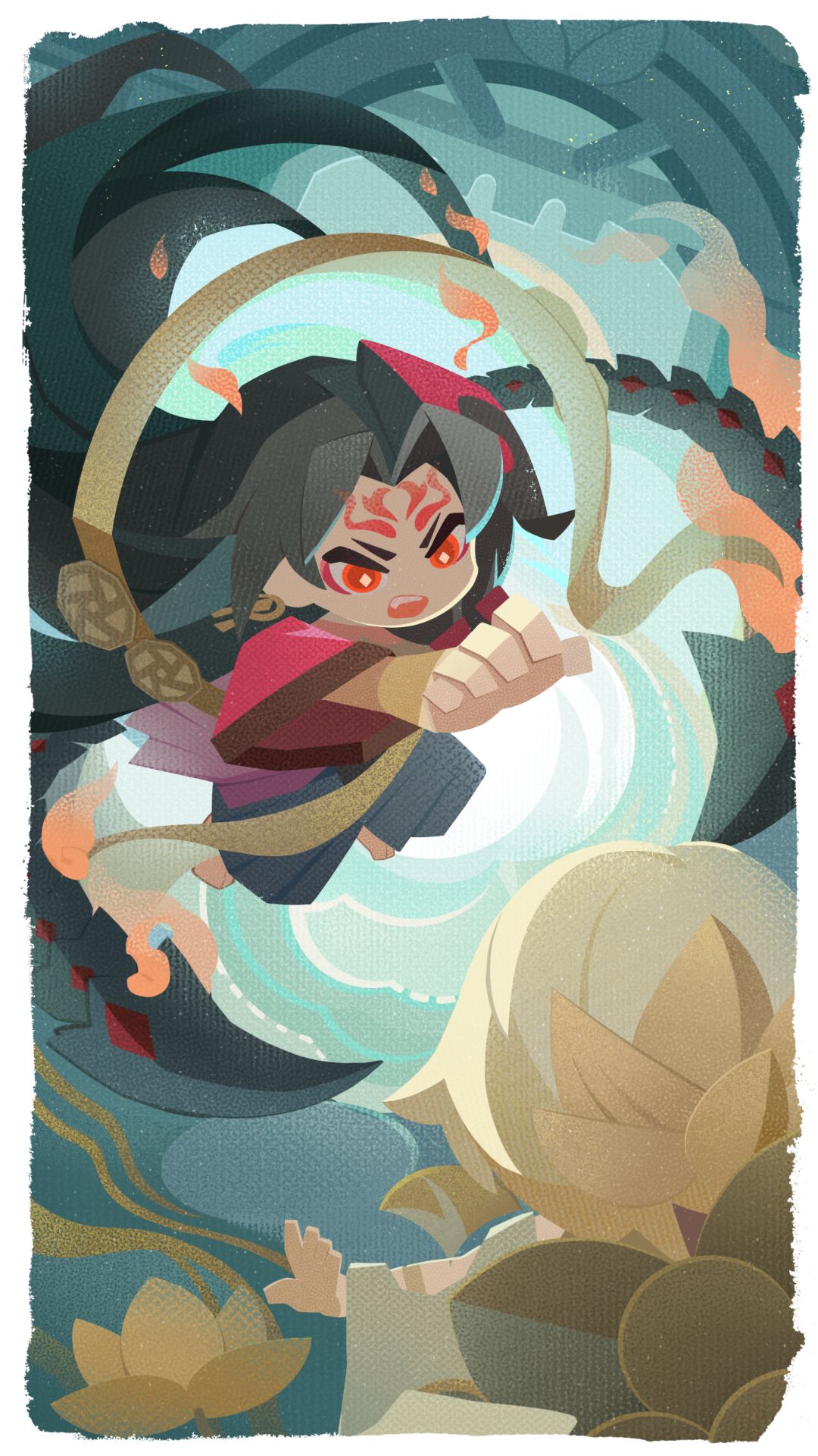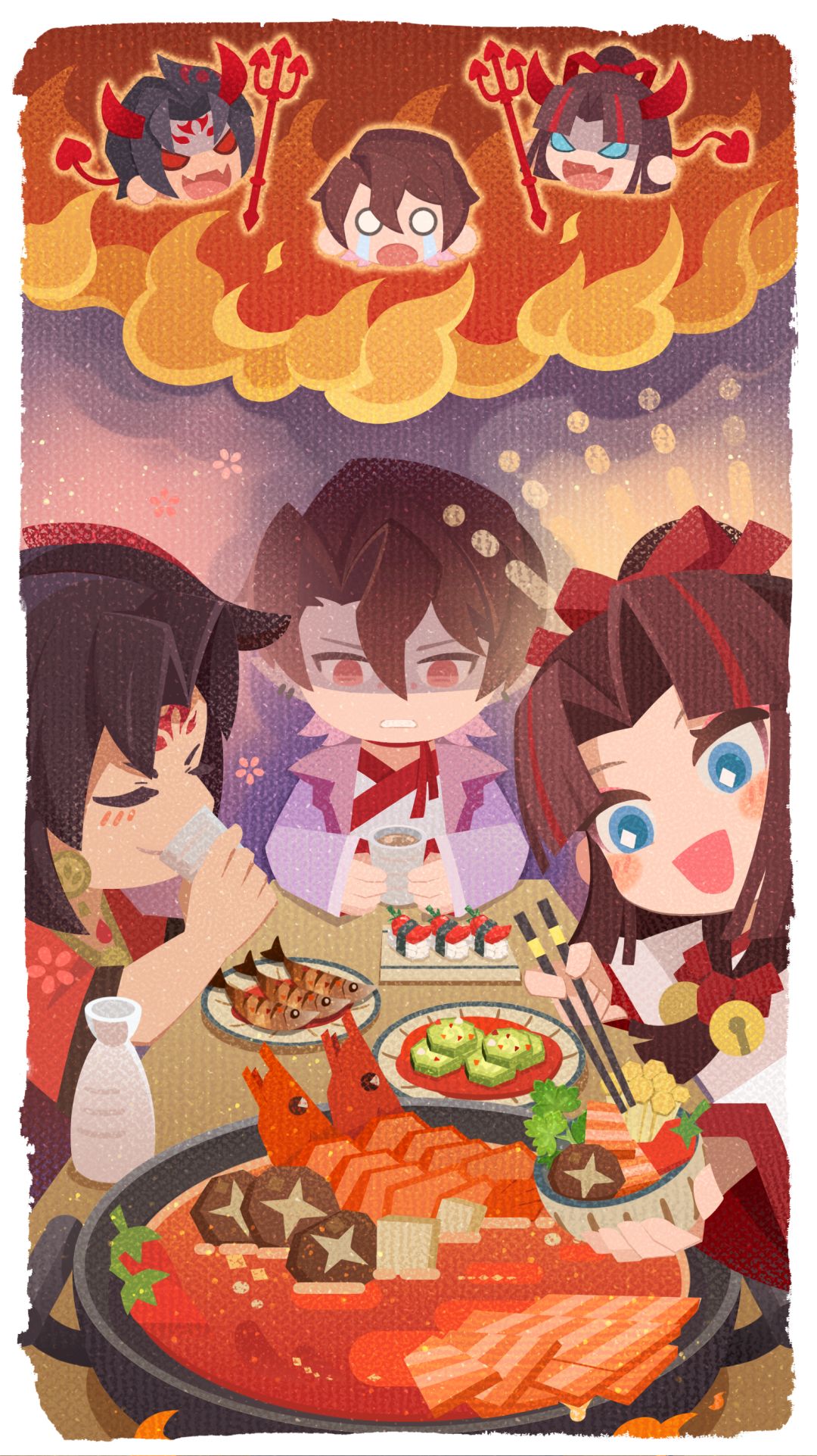 热气蒸腾汤汁翻滚 更是让吃辣爱好者们欲罢不能 这样的美食却直击狩猎强者唯一的弱点 让他如临大敌般脸色骤变 ◇鬼童丸-椒造不安◇ 鬼童丸也不知道为什么自己只是普通地路过美食屋而已却被拉去参加了一场折磨人的辣椒盛宴,他思来想去,只能想到「时运不济」四个字。 「你就是那个一点辣椒都不能吃的小子?」阿修罗席地而坐,频频打量面色发青的鬼童丸。 「勇猛的战士就该努力克服各种难关!」 「在我们那,衡量强者的其中