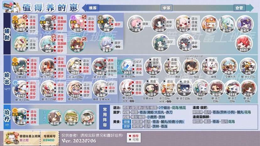 培养图,附大蛇和童先生彩蛋。鬼童丸和麓丸有部分替代关系,但是麓丸仍然具有广泛的就业和仅次于苍连的单位时间内伤害,优先级仍然较高。