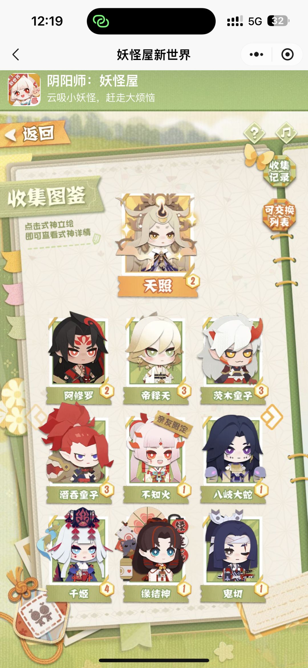 以下内容常规玩家酌情了解 关于活动: 一,玩过 1.0 的根据游戏内活动描述可领自选 SSR 一张 二,小程序活动如图收集齐卡可得 SSR 一张(还算比较简单的活动) 思路:常规两张 SSR 前期需要建议选八岐大蛇推图,或者辉夜姬辅助,因为打工式神三位高低有差距但不至于很大,实在不行随便拿个培养培养也可以将就用,但是输出式神有好坏影响,所以自选性价比比较高 关于开荒(划重点): 一,前期培养