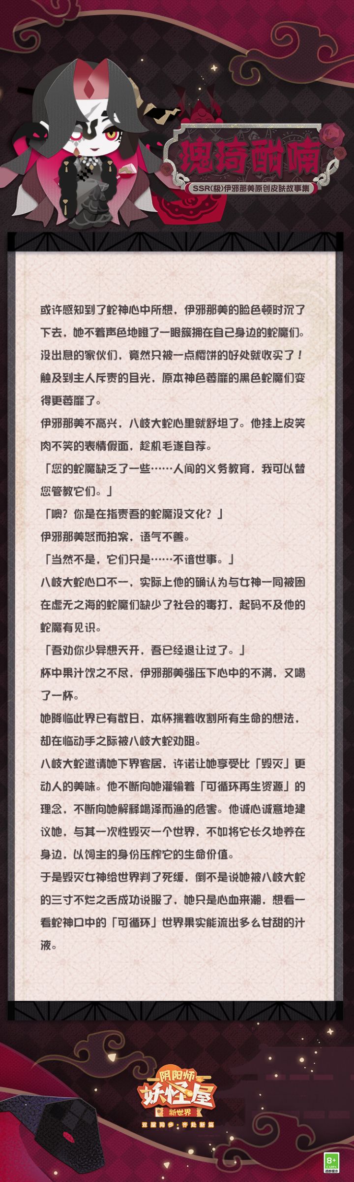舞台垂下结束的帘幕,虚构的剧目就此终结。他人之手创作的绝望虽寡淡无味,却让毁灭女神升起几分灵感。更有趣的故事,更完美的结局,当然要在她的手中宣告开始。◇伊邪那美-掌中物◇「天照,你必须向吾起誓,你永远忠于吾,永远属于吾。」「伊邪那美大人,我永远忠于您,永远属于您。」「你绝不会背叛吾。」「是的,伊邪那美大人,我永生永世都不会背叛您。」「吾会引领你跳起创造之舞,而你,也必须与吾共同跳一支灭