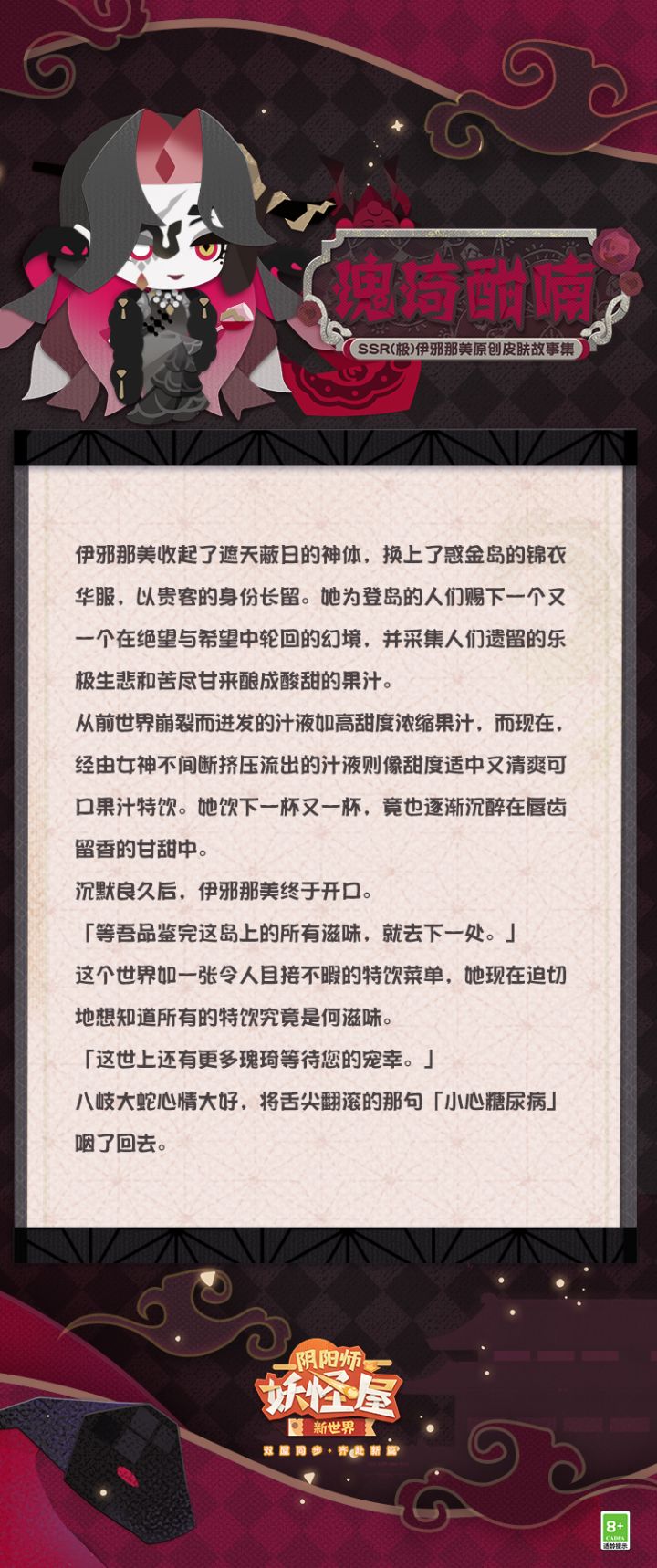 ☆妖怪屋伊邪那美版本现已开启☆宏伟的剧院,总是致力于向观众呈现「最完美」的世界。虚构的故事是否蕴含能吸引伊邪那美大人目光的魔力?家主请确保剧院内备有鲜甜可口的番茄土豆汤,以待贵宾。————1.0版本情报————※ 全新极阶式神伊邪那美来妖怪屋啦!召唤出极阶式神时,伊邪那美出现的概率提升至3倍!※ 伊邪那美典藏皮肤「瑰琦酣喃」上架皮肤商店,包含专属头像框、专属式神庭院动作与特效内容,上架首
