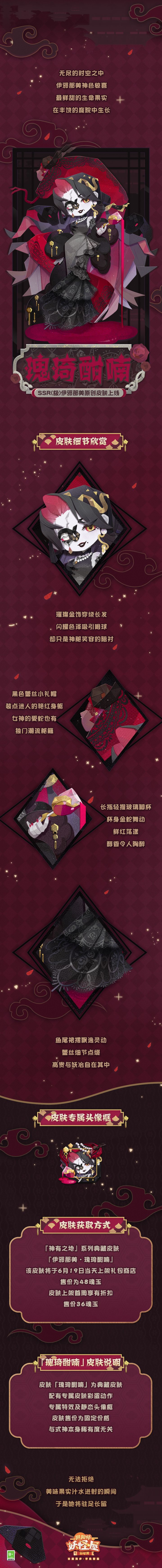◇「伊邪那美·瑰琦酣喃」皮肤现已上线 ◇岛屿繁华,自然会吸引贵客的光临。蛇魔们尽心尽力地服侍自己效忠的大人,尤以保证大人们喜爱的美味时刻充足,此一举至关重要。那多彩的「糖」与嫣红的「果汁」被摆放在同一个平面,仿佛它们的所有者也能如此互不干扰的相处。◇获取方式◇伊邪那美典藏皮肤「瑰琦酣喃」已于6月19日维护更新后,同步上架1.0版本与2.0版本礼包商店,售价48魂玉,皮肤上架首周可享受限时福