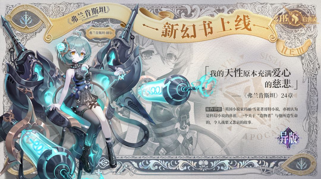 《弗兰肯斯坦》·弗兰肯斯坦·赫尔即将光临书馆~小小的幻书重新睁开清澈的双眼,里面倒映的是一整个崭新、庞大的世界。 她身上散发出的旺盛活力,就像无意间放出的电流一样,在书馆中四处流淌,点亮着馆主和幻书们的心情~ 懵懂的她对电能收放尚且生疏,却对馆主的安危时刻挂怀。在馆主生命安全受到威胁时,赫尔会出现暴走现象。当晴好的天气突然开始打雷闪电,可能就是赫尔的功劳……