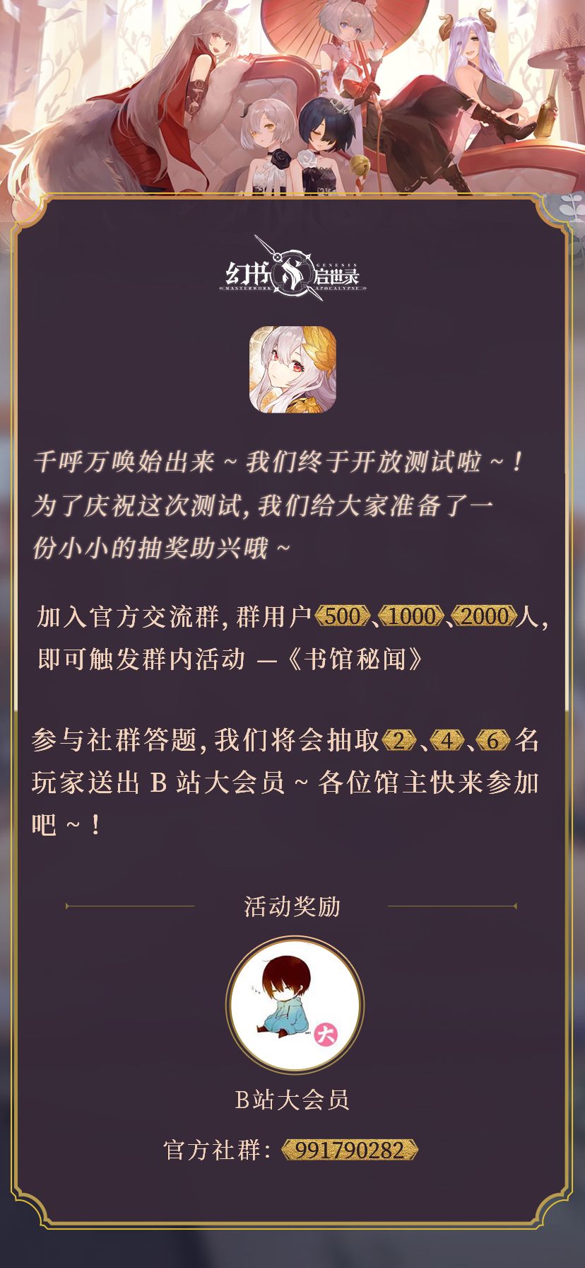 馆主大人们,幻书删档限号计费测试即将要开始咯~! 我们准备的精彩的游戏和最新的游戏活动资讯等你呦~ 各位馆主大人可以在这里收获精美的同人图片、壁纸以及周边, 丰富的活动,以及第一时间的测试相关信息~! 加入我们吧~结识更多风趣幽默的馆主大人,一起等待测试和公测叭!