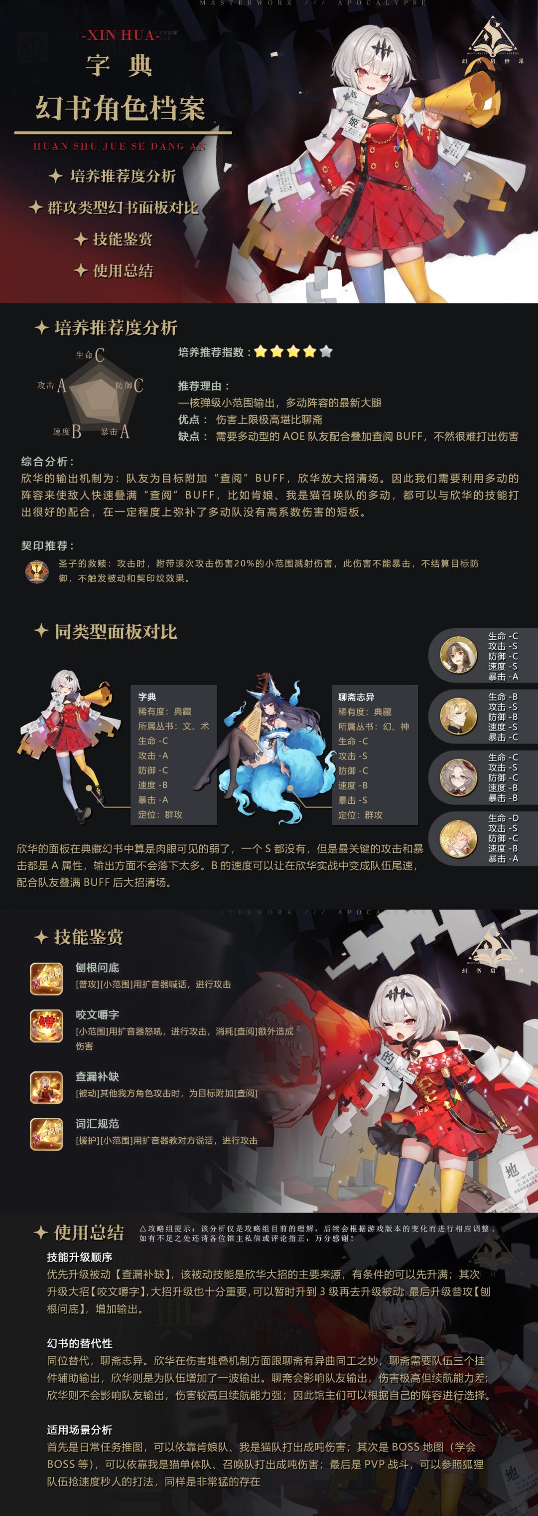 热乎新鲜肝出来的欣华到了~《字典》资料卡奉上! 核弹级小范围输出,多动阵容的最新大腿!欣华的输出机制为:队友为目标附加“查阅”BUFF,欣华放大招清场。因此我们需要利用多动的阵容来使敌人快速叠满“查阅”BUFF,比如肯娘、我是猫召唤队的多动,都可以与欣华的技能打出很好的配合,在一定程度上弥补了多动队没有高系数伤害的短板。
