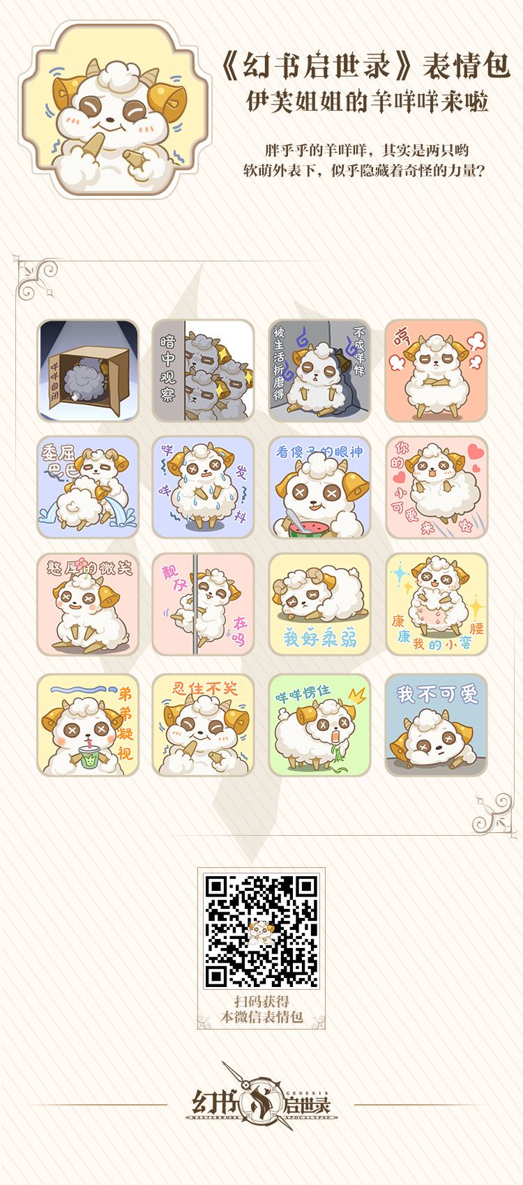 今天清晨姬还在梦游仙境时,突然感到身上一股重压。睁开眼,发现死海文书姐姐的小羊正趴在胸口,满脸写着无辜(o´・ェ・`o) 今天突然降温,这天降的羊毛抱枕是真滴好鸭!馆主大人想不想来薅一把羊毛呢?其实,可爱羊咩咩在馆内的快乐生活,早就被本姬用“表情包”记录下来啦~! 馆主大人只要通过微信扫码,就可以获取全套表情包~或关注“幻书启世录”官方公众号,回复“羊咩咩来啦”,还可获取表情包原图。 快来评论区铺