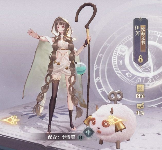 【角色设定】智者的纯白罩袍盖住了朴素的麻花辫长发,身上穿着的由白纱织就而成的古典沙漠服饰,繁复清凉,丝毫掩盖不住这位指引者典雅的身形。她左手持着也许是主带领以色列人走出埃及时所用的权杖,右手指往了遥远的兴许有着丰盛应许之地的方向。她的腰间,别着的透明烧瓶里,装着用于洗礼的圣水。她的身旁,还伴着一只默默承担着原罪的羔羊。这位圣洁而万能的指引少女,便是幻书《死海文书》伊芙。 破格后的伊芙,手中的亚伦之