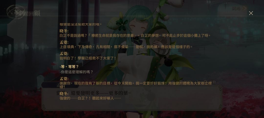 谁还记得《妄言无忌》的活动? 最近日台服开妄言,我就跑去看剧情(之前每次都跳掉,所以才到别的地方重新体验,录下来的总感觉没那味儿),然后就发现了这个 ——“学医已经救不了大家了!” 于是,当大家快忘记这段flag的时候,她出现了 当白芷放下了她的大草,拿起了海马时,就是新一代物理孟婆出世之日(昏昏沉沉不知道自己在说什么