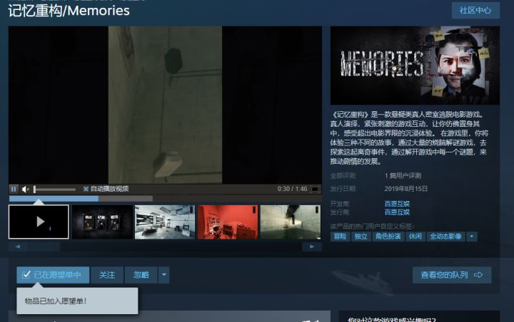 我朋友研发并发行的《记忆重构》今天正式上线steam发售了!作为国内少数且品质较高的真人互动视频题材的产品,这款质量较高;(当然和“隐形守护者”没法比,成本不一样,而且也不太同;)希望大家对真人互动、冒险解密感兴趣的朋友支持一下!游戏名称:记忆重构/Memories商店地址:游戏介绍:《记忆重构》是一款悬疑类真人密室逃脱电影游戏。真人演绎,紧张刺激的游戏互动,让你仿佛置身其中,感受超出电