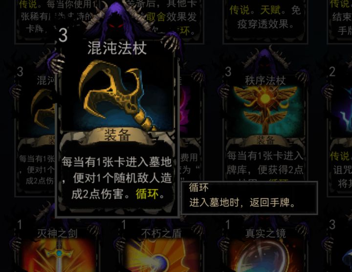 圣杯让我的牌不会被销毁,所以可以一直循环加护盾,等着时机成熟用翻倍加盾击秒死神 开始是攒了一堆牌,用冥想换了羽毛,100%闪避,顺便也解决了这个怪带穿透的问题 真巧又摸到个盾击(这时候就开始想攒防御秒死神) 然后就用掉了金属化,让防御翻倍 再用冥想把金属化从墓地里置换出来 虽然盾击被替换掉了,但100%的闪避给了我足够的时间 等摸到一些可以换卡或者抽卡的技能牌,迟早搞回盾击 刚好这个怪又可以成长,自动加血,以死神的伤害是绝对搞不死它的(就这还死神?) 🐶死神来收神了